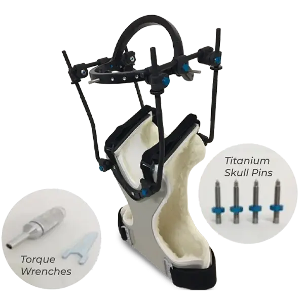 An advanced, non-invasive halo traction system designed to provide rigid immobilization of the cervical spine without the use of skull pins. This pinless variant offers the stabilization of a traditional halo vest while aiming to eliminate common complications like pin-site infections and loosening, significantly improving patient comfort, safety, and quality of life during recovery.
